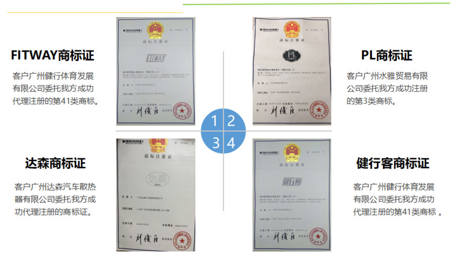 经过几年公司的迅猛发展,现已形成专业的商标代理注册体系,内部商标注册服务完善,为众多企业商标注册提供了优质的代理服务、一手的行业咨询和行之有效的建议。在权安团队的帮助下,已有众多企业注册到了心仪的商标。以下不完全列举权安团队成功注册的商标实例,让您领略我们的专业。